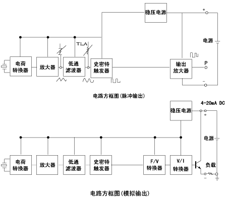 轉(zhuǎn)換器是將檢測(cè)元件檢測(cè)的微弱電信號(hào)(雜亂的正旋波)進(jìn)行放大、濾波、整形等處理,輸出與流量成比例的脈沖信號(hào)或者轉(zhuǎn)換成標(biāo)準(zhǔn)4~20mA信號(hào)。FFM63系列渦街流量計(jì)的轉(zhuǎn)換器電路示意圖如下圖所示: |